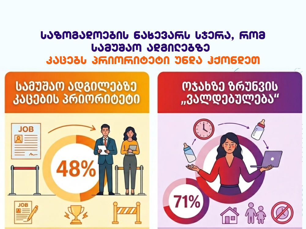გამოკითხულთა თითქმის ნახევარი (48%) მიიჩნევს, რომ ქვეყანაში სამუშაო ადგილების სიმცირის პირობებში, დასაქმებისას უპირატესობა კაცებს უნდა მიენიჭოთ. ეს აჩვენებს, რომ კაცი კვლავ აღიქმება ოჯახის მთავარ „მარჩენალად“, ხოლო ქალის შრომა — მეორეხარისხოვნად.
